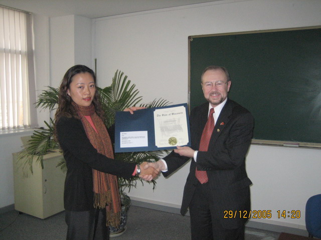 威斯康星州非常重视与中国在商业、教育等各方面的交流和发展。讲座开始前,杰姆·库茨先生将受威斯康星州州长委托转交我校党委书记焦文俊教授的证书以及威斯康星州徽章交与国际交流合作处汪滢老师,欢迎ob真人竞猜师生到威斯康星州访问、交流。