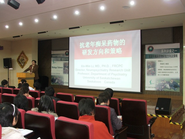 在讲座中,李新民教授介绍了目前在抗老年痴呆这个领域上的总体情况及其目前的研究动态。他指出抗老年痴呆是一个对人类健康与发展具有重要的一个方面,在讲座中他重点讲述了老年痴呆症的病理、其在各国的发病情况、目前的治疗手段以及今后的治疗药物的研发方向和策略。现阶段随着医疗手段的发展和进步,对治疗人类的各种病症都起到了积极的作用,但是老年痴呆症人们还没有完成的攻克,李教授分析了这其中的各个环节,并提出了自己独到的见解和一些战略问题。