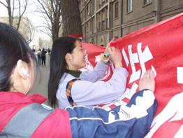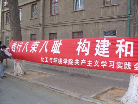在全面组织学习的基础上,为进一步在全校范围内掀起学习社会主义荣辱观、树立正确的世界观、价值观和人生观的高潮,掀起号召全校同学一道为构建和谐宿舍、和谐课堂、和谐校园、和谐社会而共同努力的热潮,学院共产主义学习实践会于3月25日上午在京工食堂对面举行了以“践行八荣八耻,构建和谐校园”为主题的大型宣传签名活动。