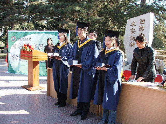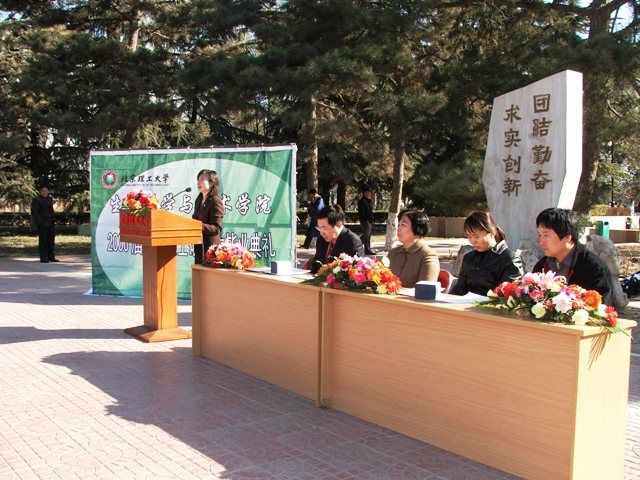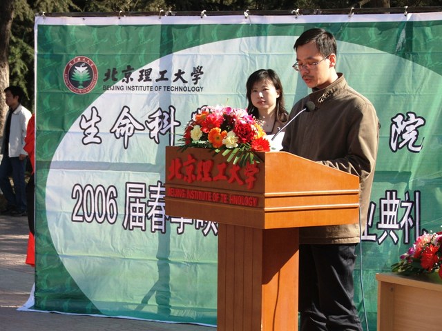 生命科学与技术学院2006年研究生毕业典礼暨学位授予仪式,于3月28日在中心花园校训碑前召开。生命学院共有28名春季硕士研究生毕业,这28名同学经过两年半的学习和科研工作,按期顺利通过答辩,均被授予工学硕士学位。本次典礼由我院党总支副书记唐晓英老师主持,到会的领导还有院党总支书记李兰东老师、院长邓玉林老师,副院长罗爱芹老师和副院长庞思平老师。此外还有许多在读硕士生和博士生以及本科生代表参加了这次典礼,为已毕业的同学送上了诚挚的祝福。