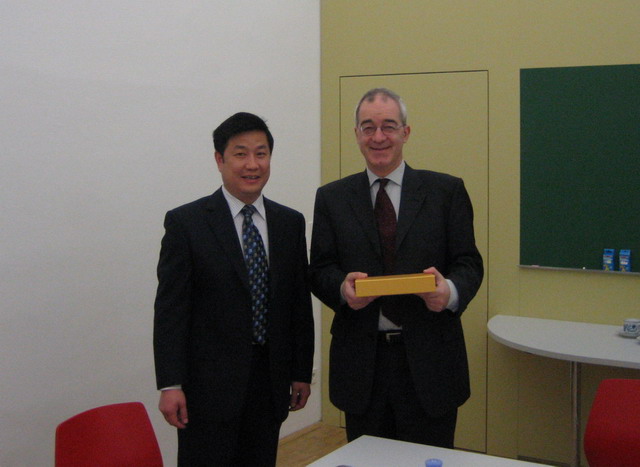赵长禄副校长介绍了我校情况,向Mettinger副校长赠送了纪念品,并对维也纳大学感兴趣的我校研究生管理、科学研究等一些问题作了回答。