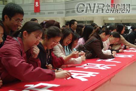 首都大学生代表在“保护知识产权,促进创新发展”的长幅上签名