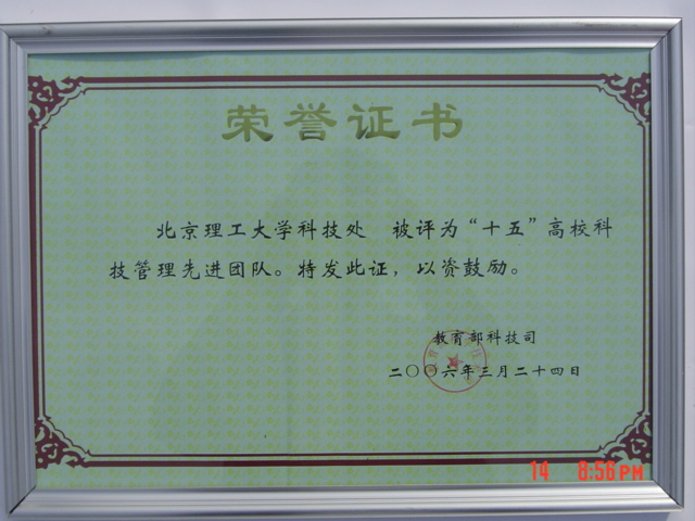 日前,在教育部科技司召开的高等学校科技工作会议上,我校科技处荣获教育部“十五”高校科技管理先进团队称号。