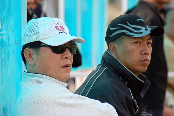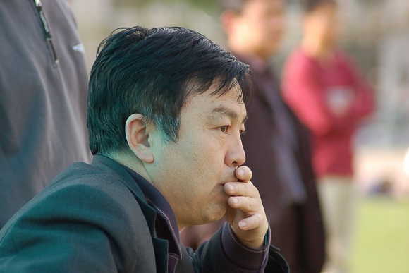 虽然比赛暂时落后,但我校足球队主教练金志扬和教练王力依然运筹帷幄,成竹在胸。