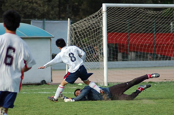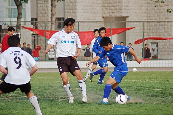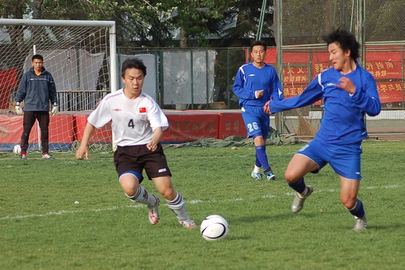 4月24日下午,为迎接即将开战的全国足球乙级联赛,我校足球队(白衣)与安徽九方足球队(蓝衣)进行了一次热身赛。我校足球队作为飞利普全国大学生足球联赛的三联冠,今年5月开始将首次参加全国足球乙级联赛,这也是中国足球联赛中第一支完全由在校大学生组成的球队。而安徽九方足球队是去年全国乙级联赛的第四名,双方球队实力非常接近,虽然这两只队伍在第一阶段比赛中分属南北两个大组,但比赛还是吸引了众多师生员工前去观战。