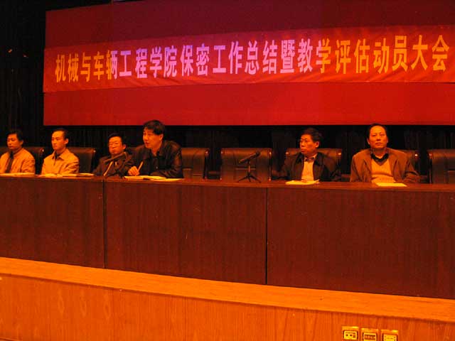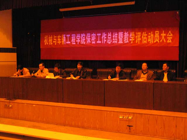 2006年4月26日,机械与车辆工程学院在七号教学楼一层报告厅召开了“机械与车辆工程学院保密工作总结暨本科教学工作水平评估动员会”。机械与车辆工程学院院长项昌乐、副院长张英、副院长左正兴、副院长徐春广、副院长王文清、副院长丁洪生、副书记、副院长郝洪涛及全院教职工参加了大会。会议由副书记、副院长郝洪涛主持。会议对学院开展武器装备研制一级保密资格认证以来的保密工作进行总结与表彰,并就形成长效机制下的保密工作进行了新的部署与安排。会议传达了学校、学院迎接本科教学评估的精神与重点内容,并对本科教学评估进行了部署与动员。会议通报了学院2006年度总体工作计划及重点工作内容。