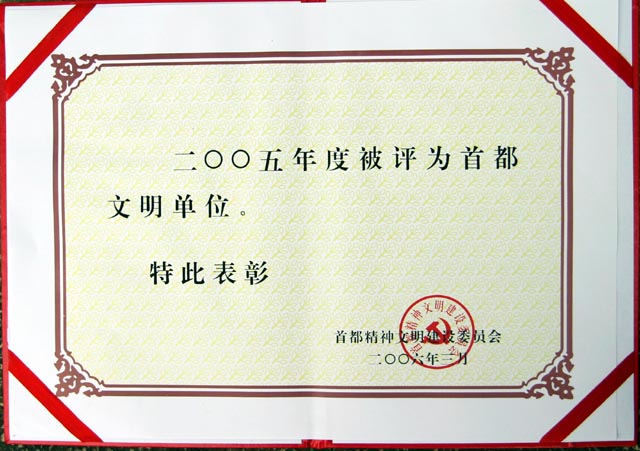 近日,由北京市委、市政府和首都文明委召开的“首都深入落实社会主义荣辱观暨2006年精神文明建设工作大会”在北京会议中心举行。会议表彰了2004-2005年首都精神文明建设的先进单位和个人,我校荣获“二〇〇五年度首都文明单位”荣誉称号。