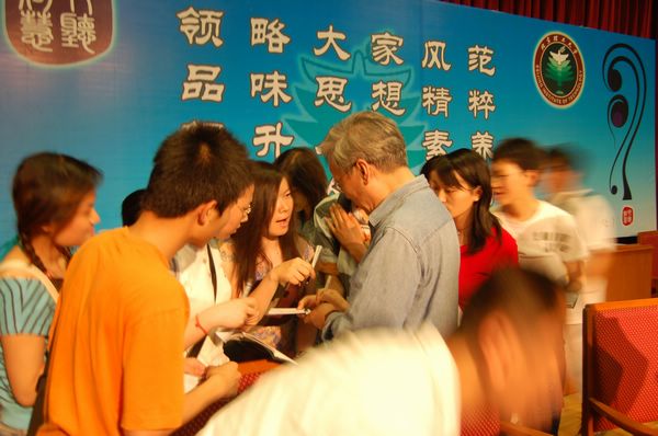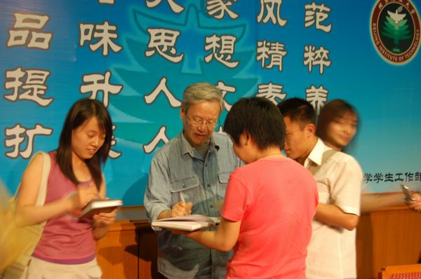 谢飞导演对这些问题进行了分类解答,他的机敏、睿智的回答赢来了同学们的阵阵笑声和掌声。演讲结束后,同学们纷纷上前请谢飞导演签名合影,谢老师愉快的答应了同学们的请求。