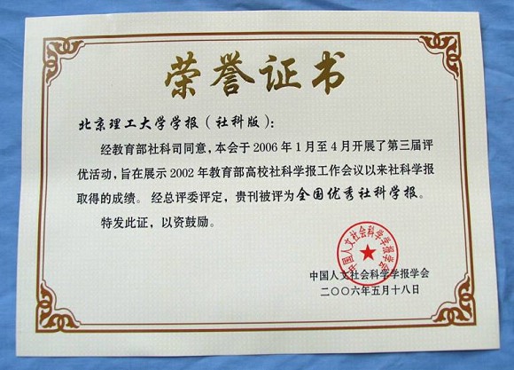 近年来,在校领导的关怀下,在编委会的领导下,经过编辑部全体同志的努力,我刊取得了长足的进步,先后曾荣获全国理工农医院校社会科学学报优秀期刊、全国高校社科学报质量进步奖、北京市优秀社科学报奖。