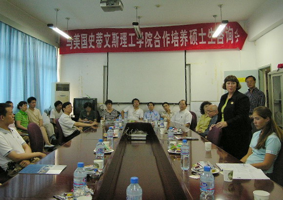 (前排中杨宾副书记、副校长,前排左二Moreen Weatherall副校长,前排左一Stevens物理系崔洪亮教授,前排右一国际交流合作处王庆林处长,右二Stevens网络教学部Robert Ubell主任;后排左二研究生院常务副院长吕昕教授,左三Stevens中国事务顾问陈映茜女士)