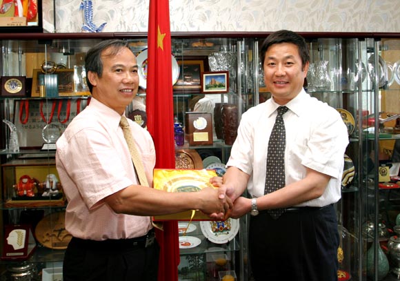 赵长禄副校长代表ob真人向越南考察团详细介绍了我校在科研及技术转让方面的成功经验,并和来宾就一些双方共同感兴趣的问题展开讨论。越南教育培训部阮福卿副司长、归仁大学陈信杰校长在随后的发言中也介绍了越南高等学校在鼓励科研创新、促进技术转让等方面所采取的政策措施。赵长禄与越南教育部科学技术司副司长阮福卿互赠纪念品。