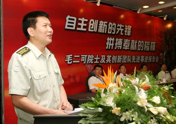 最后,孙来燕副主任作了重要讲话,代表国防科工委党组,就深入开展向毛二可院士及其领导的科技团队学习讲三点意见:学习毛二可院士爱党爱国、无私奉献的崇高信念,忠诚实践“三个代表”重要思想,做永葆共产党员先进性的模范。学习毛二可院士勇攀高峰、不断创新的进取精神,大力提高自主创新能力,做创新型国防科技工业建设的模范。学习毛二可及其领导的科技团队团结协作、淡泊名利的团队精神,大力践行社会主义荣辱观,做军工先进文化建设的模范。