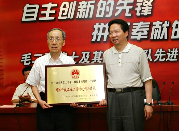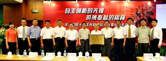 国防科工委副主任、党组成员陈求发同志在报告会上为毛二可院士领导的创新团队颁发了“国防科技工业优秀科技创新团队”的奖牌。