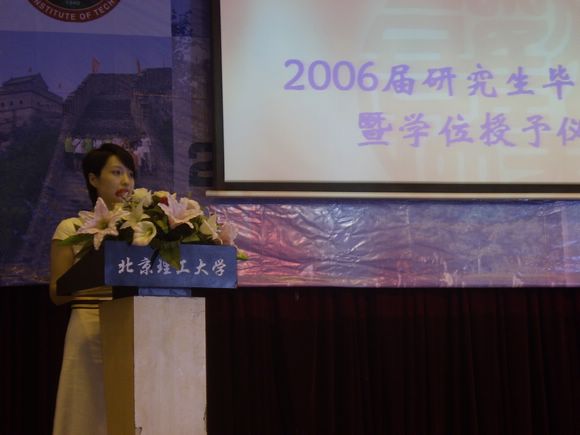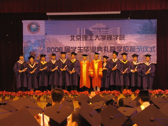 2006年7月11日下午2点, 理学院2006届研究生毕业典礼暨学位授予仪式在七号楼报告厅隆重举行。理学院分党委书记何明老师、院长胡更开老师、副院长胡海云老师、王瑞珍老师,学院学位委员会主席葛渭高老师和理学院即将毕业的137名同学以及部分学生家长一同参加了毕业典礼。典礼由理学院分党委副书记、副院长姜艳老师主持。