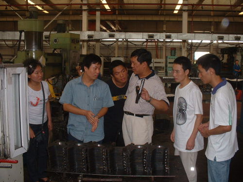 后来,在校友的引导下,我们参观了银华机械厂三个分厂的车间,看到了各种各样的机床和大型加工设备,对现代化工厂有了更清晰的认识。在工厂里,我们还很巧地碰见了机车学院的几位教授和研究生,他们是受邀来帮助银华厂解决生产中的实际问题的。高校与企业产、学、研的有机结合,正是能促进企业发展、并带动大学生和研究生在实践中升华知识的双赢途径。
