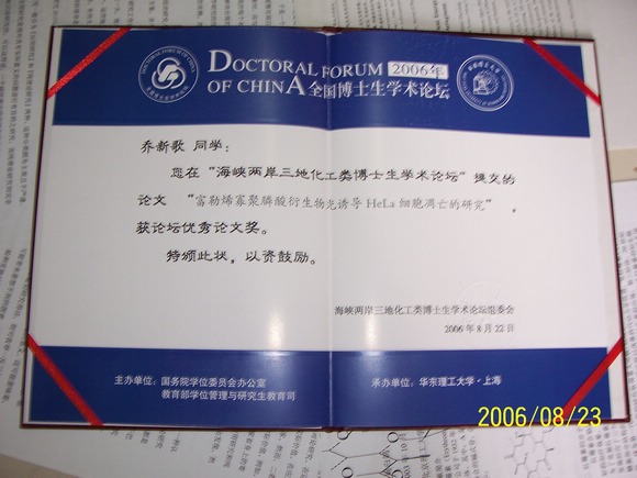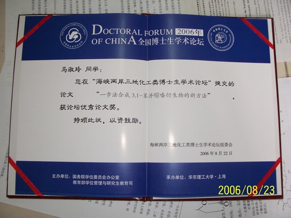 2006年8月21日至8月23日,由国务院学位委员会办公室和教育部学位管理与研究生教育司主办,华东理工大学承办的“第四届全国博士生学术论坛(化工类)——海峡两岸三地化工类博士生学术论坛”在上海举行。我校管理学院博士生采峰,生命学院博士生乔新歌,化工学院博士生马淑玲参加了此次大会,研工部副部长魏名山带队出席。