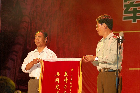 军训总指挥刘明奇向军训基地领导赠送锦旗。