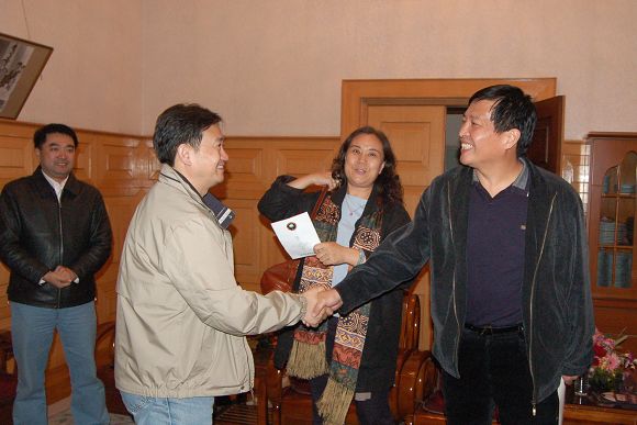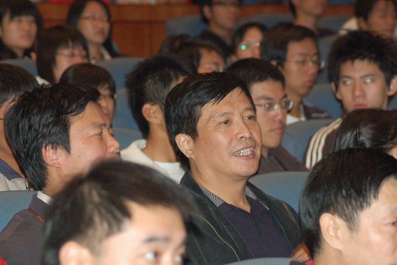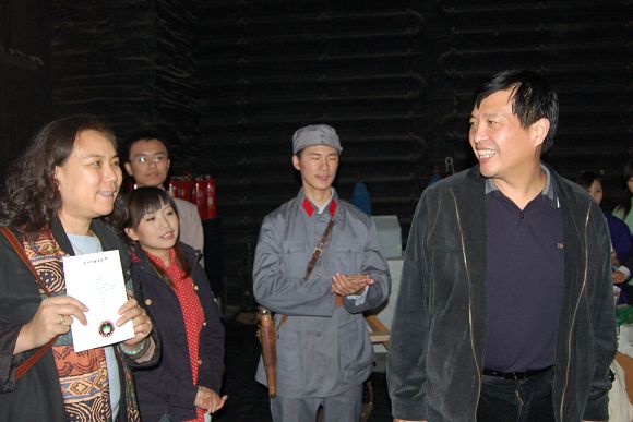 我校党委副书记侯光明与大学生戏剧节评委会成员在交流。