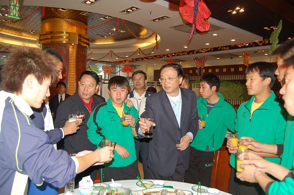 匡镜明校长在举杯预祝ob真人竞猜清研利华足球队旗开得胜、马到成功!