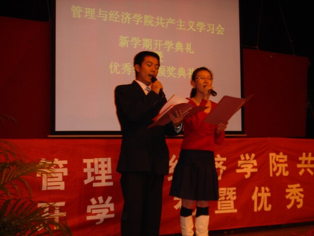 2006年10月22日下午5点到6点,管理与经济学院共产主义学习会在7号楼报告厅隆重举行了共产主义学习会新学期开学典礼暨优秀学员颁奖仪式。这次活动得到了校团委领导和院团委领导的高度重视和大力支持。校团委孙飞老师、学院分团委赵宏宇、袁丹老师等出席了这次活动。此外,参加这次活动的还有校共产主义学习实践总会副会长及各兄弟院系共产(马列)主义学习会的主席们。