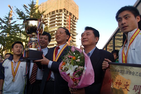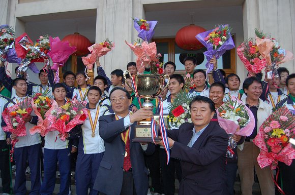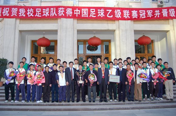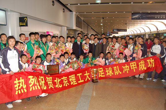 2006年11月4日(周六)14:30,获得2006年中国足协乙级联赛冠军并冲甲成功的我校足球队顺利从重庆飞抵首都机场,党委副书记赵平携师生员工代表前往机场热烈欢迎。
