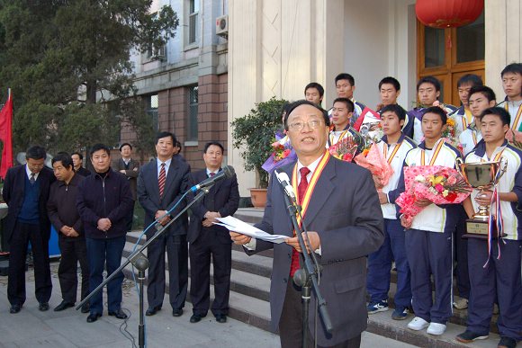 匡镜明校长在讲话中指出,我校学生足球队在比赛中能取得如此骄人的成绩,传承了学校六十多年的光荣传统,是体育回归教育、体育与教育结合的一次有益尝试。他强调,队员的学生身份不会变,球队“非盈利”的性质不会变,以学校管理为主的体制不会变。他对足球队提出了要求,足球队要在更高、更新的起点上虚心向强手和职业队学习,认认真真打好每一场比赛,为学校添彩,为大学生争光。