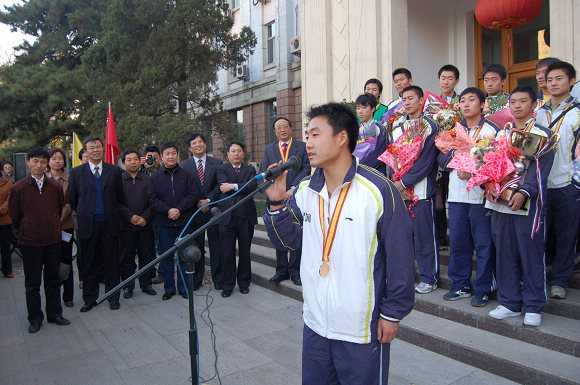 金志扬总教练看到这种热烈的场面非常激动,他代表全体教练员、全体队员对学校领导和全校师生对足球队的正确领导和殷切关怀表示感谢,他表示一定要按照学校领导的要求和全体师生的希望,面对挑战勇往直前。