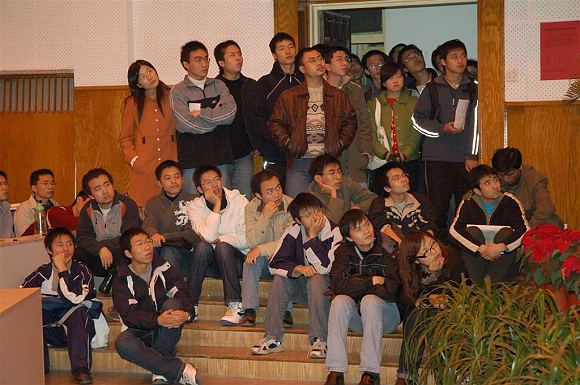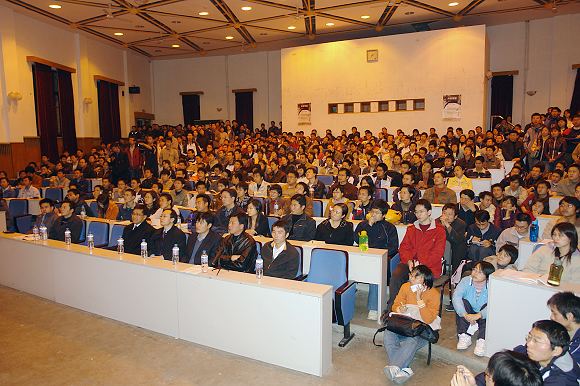 广大同学怀着强烈的求知欲望聆听讲座,会场走廊上、台阶上、门口都挤满了人。