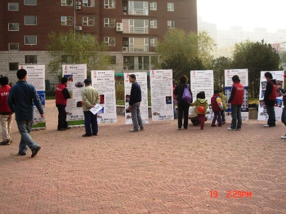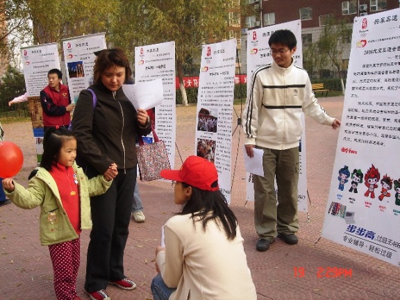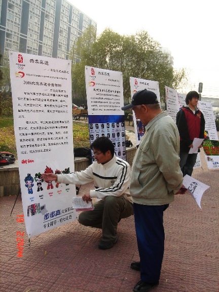 下午两点钟活动正式开始,庞大的展板阵容马上就吸引了很多居民的驻足。热情的居民不断向同学们询问奥运会的各种知识,同学们更是不遗余力地一一进行详细解答并补充一些相关知识,让市民更加充分地了解奥运、支持奥运。活动在融洽的气氛中进行着。