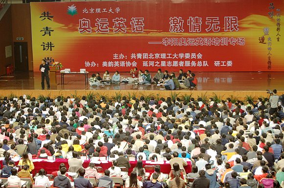 2006年11月21日星期二下午3:00,由校团委主办,美韵英语协会、延河之星志愿者服务总队和研工委承办的以“奥运英语、激情无限”为主题的专场报告会在刚刚落成的我校体育文化馆隆重拉开,立志“让三亿中国人讲一口流利的英语,让三亿外国人讲一口漂亮的汉语,让中国之声响彻全世界”的“疯狂英语”创始人李阳老师,亲自为4000多名大学生做了奥运英语培训专场报告会。