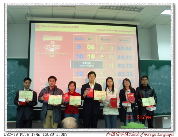 2006年11月16日在研究生楼301和501同时进行了初赛。来自全校各个学院的37名硕士生和博士生同台竞技。最终16名选手脱颖而出进入决赛。决赛现场气氛十分热烈。讲台上,参赛选手声情并茂,洋洋洒洒,详尽阐述 “Success in My Eyes”。问答环节,面对提问教师频频“刁难”,他(她)们机敏应对,精彩连连。讲台下,听众的呼声掌声一浪高于一浪。经过激烈的角逐和评委们的认真评判,决赛共评出了一等奖3名,二等奖5名,三等奖7名。