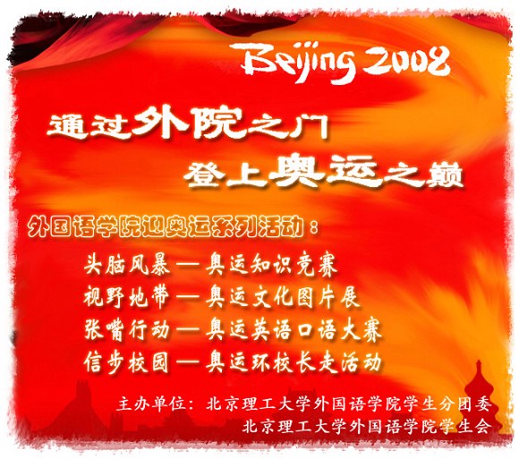 活动旨在传播奥运理念,培养志愿服务精神,拓展综合素质,争做奥运会志愿者,为奥运会做出外国语学子自己的贡献。