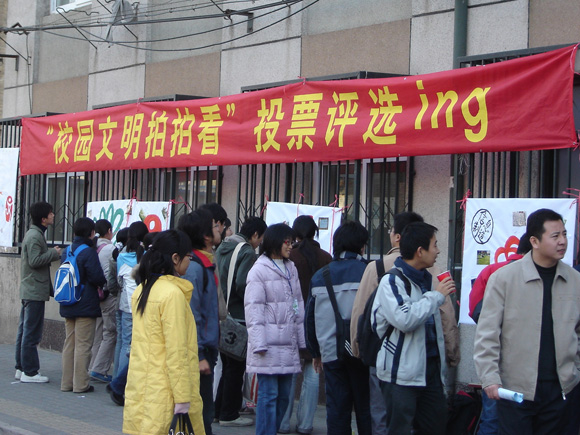 从11月中旬开始征集作品,在将近一个月的时间里有120多位选手参赛,优秀作品层出不穷。经过初选,复选以及最后的大众投票、网络公开评选,选获奖作品脱颖而出,其中主题涵盖了校园生活的各个角落,反映占座问题的69号作品“后天是数学课”获的了此次大赛的一等奖、反映校园卫生、资源浪费、停车、食堂问题的五部作品分别获得了二、三等奖。