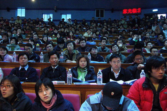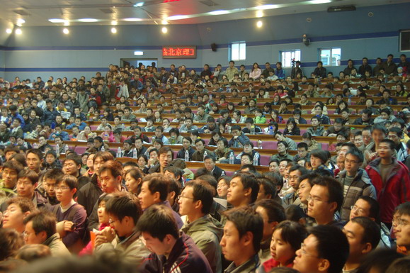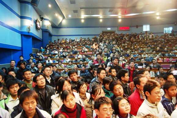 ob真人部早在报告会开始一周前就通过网站、论坛、海报、喷绘等多种形式对本次报告会展开了大规模宣传,使这场报告会受到了同学们的广泛关注。在报告会开始前6个小时就有同学来到会场等候,报告会开始前一个小时所有座位都坐满了观众,过道和讲台上都挤满了热情的听众。