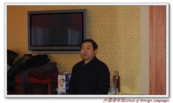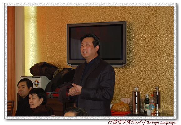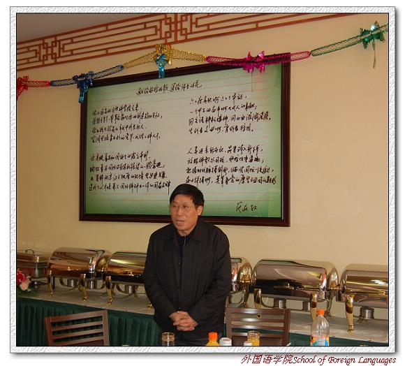 外国语学院党委书记王文清老师代表学院党政领导向老教师们表示新年问候,介绍了学院党委一个学期以来所做的工作,强调学院党委工作重要内容之一就是在学校的领导下建立和谐校园,学院要加强工会工作,关心教职工生活与健康。最后他衷心祝愿老教师们身体健康!万事如意!家庭幸福!