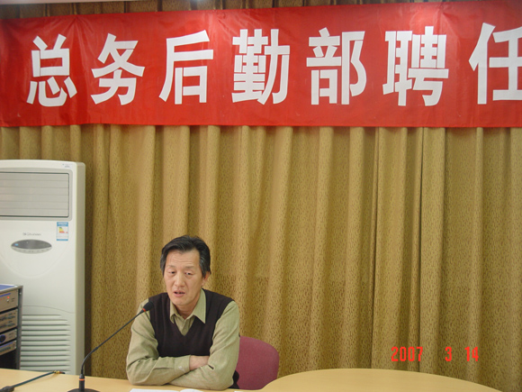按照后勤集团全员聘任工作的安排,2007年3月14日下午,在后勤办公楼二层报告厅召开了“总务后勤部聘任工作动员会”。后勤集团党委书记李盼兴、副书记姜金凤,总务后勤部主任杨学洲、副主任丁志坤、宋希博、徐承俊,经理助理周惠民、谭新华、总工助理朱建学,各中心正副主任、班组长及部分职代会代表参加了动员会。
