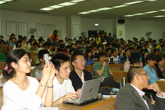 这些问题充分的体现了我校同学广泛的阅读面和深厚的人文功底。 最后,工作人员将江南的作品《光明皇帝》报上讲台,并决定将这些书籍分发给热心的观众。本次共青讲堂得到了校科幻协会的大力支持,因此他们得到了5本赠书。另外还有若干本分发给提问价值很大的同学,最后还剩下4本,主持人选择了非常别致的一种方式:江南先生自己挑选4个关于他作品的问题,台下观众进行抢答,答对者得到赠书。