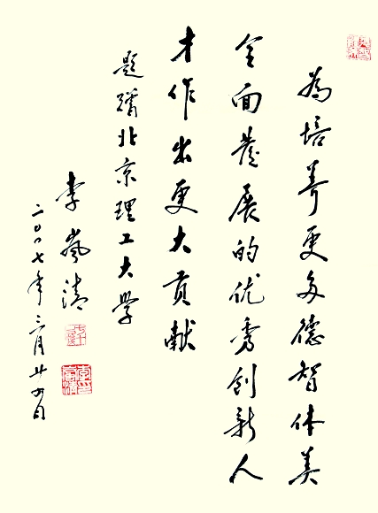 2007年3月24日,李岚清同志应邀为我校题词,鼓励我校“为培养更多德智体美全面发展的优秀创新人才作出更大贡献”。