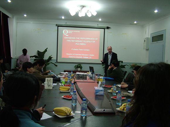 我校材料科学与工程学院“985工程”引智计划聘请的两位聚合物阻燃材料国外专家:美国Marquette大学化学系教授Charles A. Wilkie及英国Queen’s 大学机械与航空工程学院Peter Hornsby教授,来我校进行了为期十余天的学术交流、指导研究生、参加我校主办的第四届阻燃技术与阻燃材料最新研究进展研讨会等学术交流活动。杨树兴副校长于2007年3月30日下午会见了两位客座教授,对他们的学术交流工作表示感谢,并希望通过双方的学术交流增进两校之间的深入合作。参加会见的有国际交流合作处的汪滢副处长、材料科学与工程学院分党委书记张德平等。