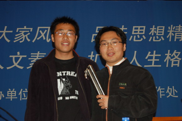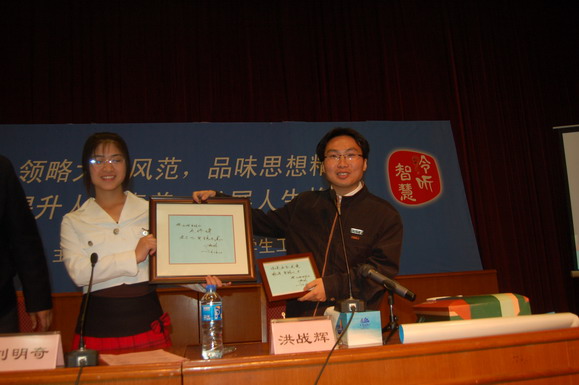 ob真人部部长刘明奇代表学校把一些具有学校特色的纪念品和讲座的海报赠送给了洪战辉同学。同时,洪战辉同学也为我校自强社准备了一份小礼物。由他亲笔题写的一幅硬笔书法作品,内容是“天行健,君子以自强不息 与ob真人竞猜自强社同学共勉”