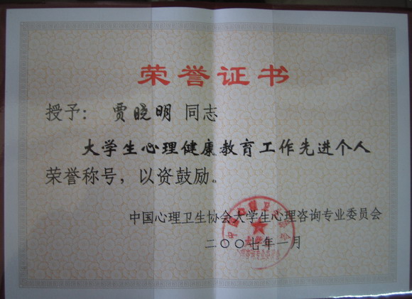 2007年1月19日——1月21日,第十届全国大学生心理健康教育与心理咨询学术交流会在哈尔滨举行。我校心理健康与咨询中心荣获中国心理卫生协会大学生心理咨询专业委员会颁发的“全国大学生心理健康教育工作先进单位”,心理咨询中心老师贾晓明教授荣获“大学生心理健康教育工作先进个人”荣誉称号。
