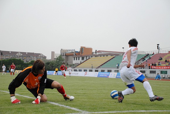 开场后双方都打的比较积极,但是相对来说上海七斗星队的进攻速度比较慢,拼抢反而不如爱国者大学生队勇猛。在双方试探性的打了10分钟以后,比赛渐渐加快了节奏,第18分钟,上海队获得任意球机会,但是并没有形成威胁,第25分钟,上海队发动进攻,左路突破传中,中路接应的上海球员横敲,但是在最后射门的一刹那没有打好,被爱国者大学生门将王毅奋力扑出。