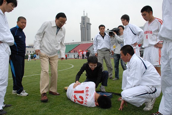 比赛结束之后,校长匡镜明在兴奋之余,亲自来到赛场中间看望舍身堵“枪眼”的刘猛同学,经过简单治疗,刘猛幸无大碍。