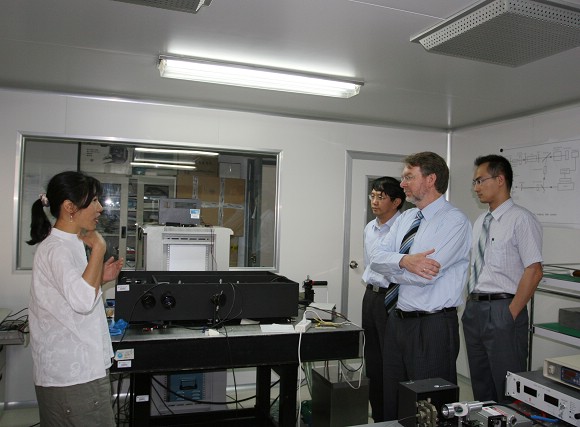 朗克副校长在信息科学学院副院长赵长明的陪同下还参观了我校的激光实验室和现代通讯实验室。杨素辉老师和费泽松老师分别向来宾介绍了这两个实验室的主要工作。