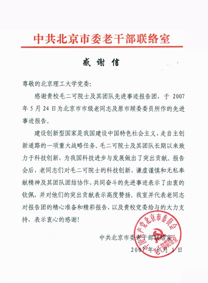 应中共北京市委老干部联络室邀请,5月24上午9:30,我校党委副书记赵平带领“毛二可院士及其创新团队先进事迹”报告团在颐和园藻鉴堂举行了报告会。30余位北京市老领导聆听了报告,并对毛院士的事迹表示高度的赞扬,对创新团队的成就和报告会本身给予了充分的肯定。会后北京市委老干部联络室发来感谢信,对我校给与的大力支持表示衷心感谢!