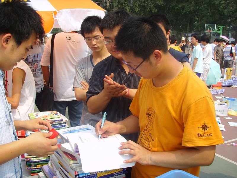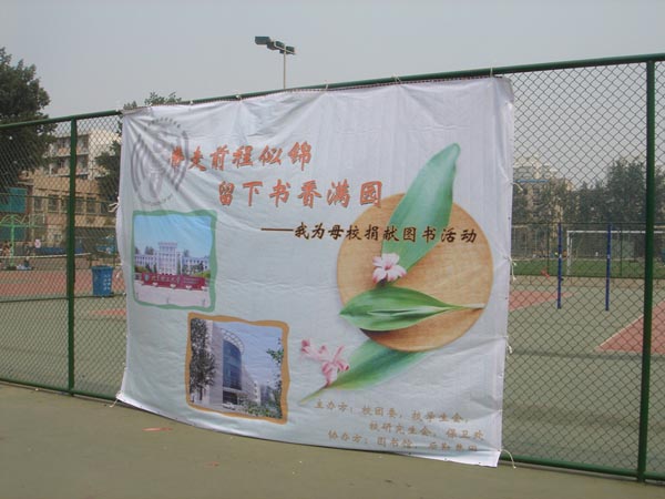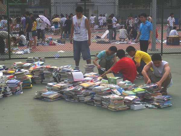 为了体现捐赠图书活动的特殊意义,参加捐书的同学,还可以在图书上签署自己的名字和寄语,同时将会给每一位捐书的同学拍照留念,在“带走前程似锦,留下书香满园——我为母校献图书”的巨大彩喷下,他们幸福的笑脸成了两天炎热天气中最清爽的一道风景线。捐赠的图书堆积如山,图书涉及面广,据捐书处的同学介绍,外语类图书的捐书量高居榜首。截至25日下午,本次活动共收到捐书近万册。校学生会将于近期将图书分类,分别送往希望小学和校图书馆。