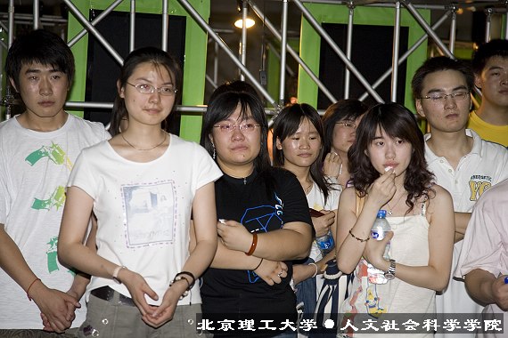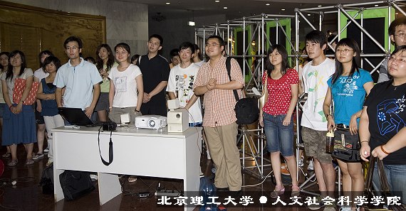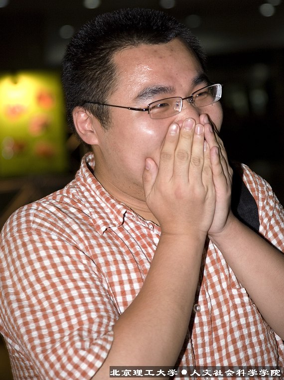 19:30,谢老师来到中教准备加班,看到这个意外的展出,谢老师十分感动。人文学院2005届学生会主席羊强振同学引导谢老师观看了图片展。当谢老师刚刚把展览看完,人文学院与外语学院几十名同学和学生干部突然出现在一层大厅和二层平台,共同为谢老师鼓掌,并齐声高呼“谢尔曼,我们爱你!”。