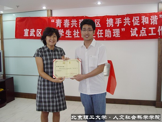 本次社区主任助理工作于7月19日开始,9月21日结束,为期两个月。推荐我校优秀在校学生担任宣武区社区居委会主任助理,利用课余时间进行挂职锻炼,是我校与宣武区人民政府区校共建的一项重要工作,是区校双方本着“相互支持、优势互补、互惠互利、共同发展”的原则,实现高校智力资源为地方经济发展服务,地方实践基地为高校培养人才服务的一项重要举措。