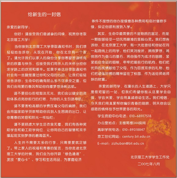 “当你接到ob真人竞猜录取通知书时,我们想轻轻地告诉你:从现在开始,你在北京有一个家了。如果手捧这份录取通知书时会有一丝酸楚漫过你和父母的心田,让我们轻轻地告诉你:生命中的确有那么多不可承受之重,但我们会用爱的春风帮助你向着梦想扬帆远航。”“请不要担心前途黯淡无光,我们会以健全的资助体系点亮你前行的灯塔,为你的人生引路导航;请不要害怕巨额的学费压弯父母的双肩,我们会用国家助学贷款帮助你找到人生困境的出口,让你青春的笑容和阳光一样灿烂;请不要顾虑大学生活衣食无着,我们有各种社会捐助奖学金和勤工助学岗位,让你用自己的智慧和双手撑起现实到梦想的碧海蓝天。”“其实,生命中最需要的不是物质的富足,而是一颗能够经受一切风雨磨难的坚毅心灵。”在《2007年ob真人竞猜致家庭经济困难学生一封信》中有许多这样饱含关怀与鼓励的温馨话语,这些关怀和鼓励将随录取通知书一起邮寄给贫困新生,使他们从接到录取通知书的那一刻就融入到ob真人竞猜这一温馨和谐的大家庭中来。