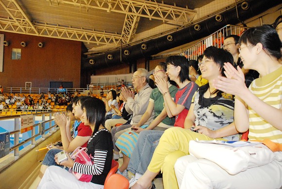 由于是周末,与前两天相比,当日看台上多了许多自费购票的观众。八岁的杨子天和爸妈一起观看比赛,他说以前很少到现场观看体育赛事,更别说残疾人的了。今天能来特高兴。子天的爸妈都在北京外国语大学工作,距离盲人门球的比赛地很近。爸妈考虑到明年北京奥运会和残奥会举办期间到现场观看比赛的可能性极小,因此采取了提前感受奥运会的“措施”。子天的妈妈说:“其实我还有一个目的,是想让她在看比赛的过程中受教育。”果然不出她所料,子天说:“原来我觉得考试太难了,可是他们盲人比我还难。”